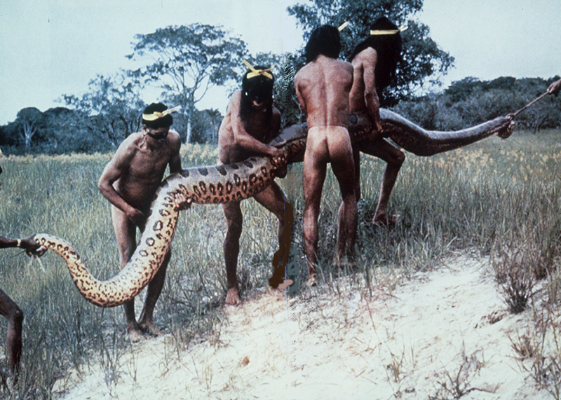 Source: WTL Latin American materials archive. Location: Brazilian Amazonian indigenous tribesmen. Images: Photograph of (naked) men; snake (anaconda); sand; grass; forest; sky Metaphors: Humans in nature; fusion of men and snake Perspectives: (A) Primitive civilization; (B) fully developed civilization Cultural humanities and a question: (A) Oral traditions; (B) lo ctónico; (C) What does lo ctónico mean? |