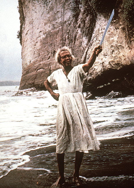 Images: Ocean shore; woman; machete; sheer cliff; wind; sand; water
