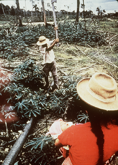 Comments: (A) The machete of previous slide becomes axe for work; (B) early conquest of nature produced Latin American society; (C) current deforestation is serious global problem.