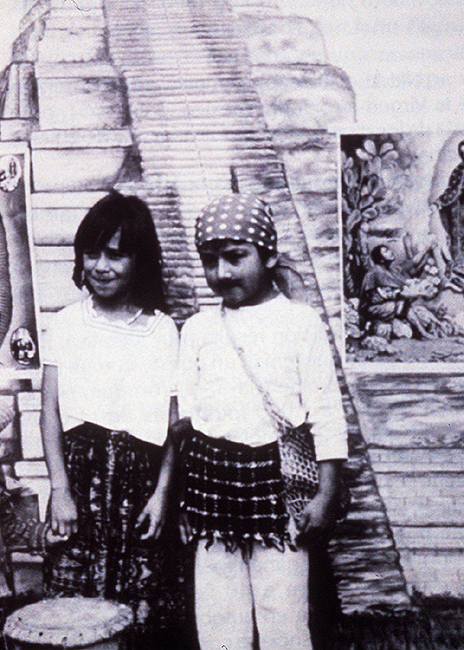 Image and comments : Photo of two girls being posed for photo in front of two-dimensional background of Mayan pyramid with devotional picture of the miracle of Juan Diego (Quauhtla Tóhuac) seeing the appearance of the Virgen de Guadalupe at Tepeyac, on the outskirts of Mexico City.