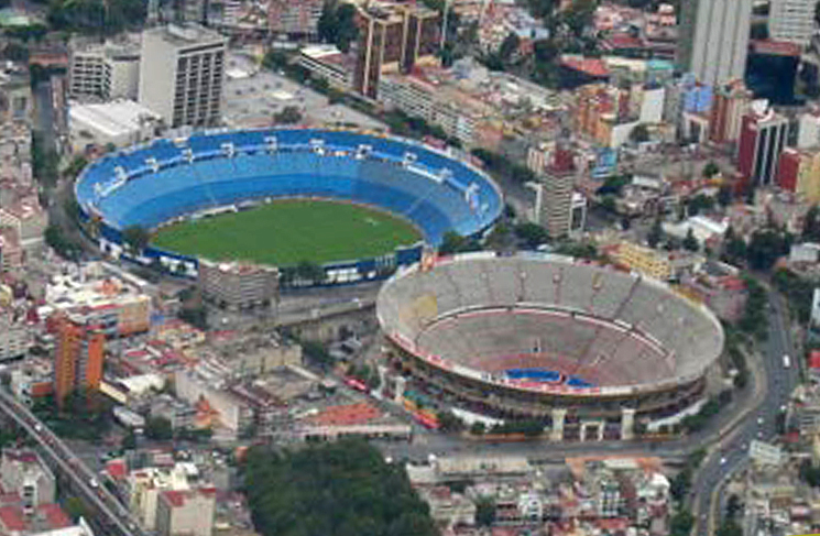 Images in this photo: Urban buildings; on the right, the bullring (la plaza de toros) adjoining one of Mexico City's soccer stadiums (Estadio Azul; the blue stadium).