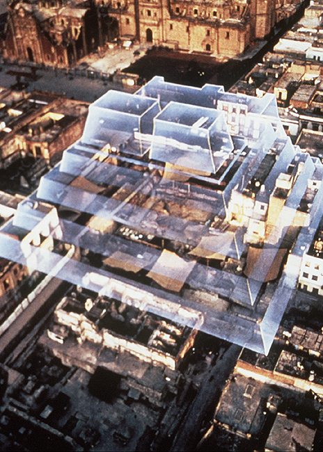 Images: Side of the (Catholic) Catedral Metropolitana with pre-1985 buildings surrounding it; artists superimposed drawing of location and architectural design of the Aztec Templo Mayor.