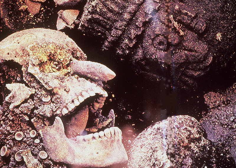 Location: México Images: Human skull; gold in eyes; pre-Columbian sculpture Comment: (A) This image is a twentieth-century artistic collage; (B) how do you interpret this collage? Cultural humanities: (A) sculpture; (B) cupio