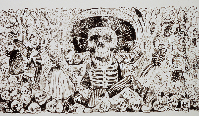Comment: Central figure is wearing a Charro's sombrero and huaraches plus he's wielding a knife. What are other figures doing? When is this scene featured?