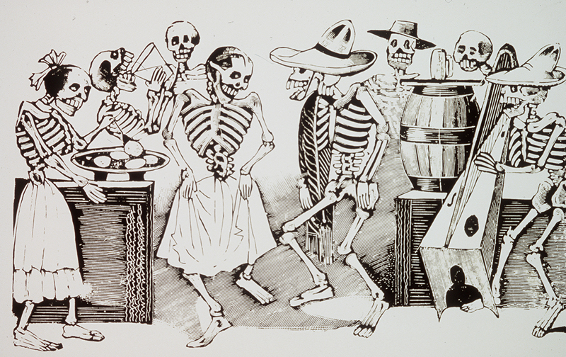 Location: Mexican drawing Images: Skeletons, drinks, cakes, harp, barrel, hats Comment: What are these skeletons doing? Why are the doing this? Cultural humanities: Drawing; popular culture