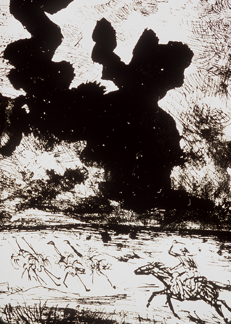 Images: A woman riding a galloping horse; four rheas (Sp. ñandú; Por. ema); clouds over plains.