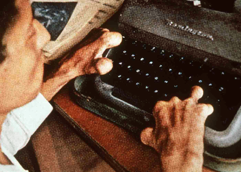 Location: Latin America Images: Man, hands, typewriter Comment: What is your interpretation of this photograph? Cultural humanities: (A) Writing; (B) photography