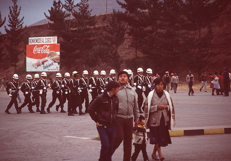 Source: WTL photo taken outside the Alejandro Velasco Astete International Airport in Cuzco. Comments: The Coca-Cola sign in the background of this photograph says: "Bienvenidos al Cusco / Deliciosa" (Welcome to Cusco / Delicious). In the foreground you see a typical family from Cuzco dressed for 12,000 feet elevation in July. And in the middle distance you see Peruvian MPs (Policía Militar) protecting the airport. |