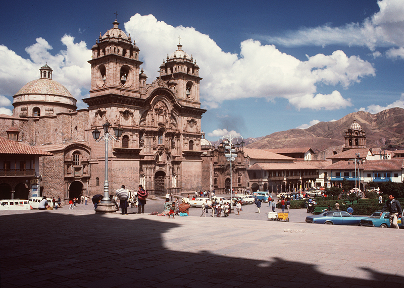 Source: WTL photo taken on the Plaza de Armas (la plaza mayor; central square) of Cuzco. Comments: To the right is part of the central square. The photographer is standing in front of the cathedral and is looking at the church of the Compañía de Jesús (Jesuit church). The Jesuit school and residence are in the building immediately to the right of the Jesuit church. This site, which is where the Inca emperor Huayna Capac's palace stood, was subsequently used for the mansion of Pizarro's brother, Fernando Pizarro. The typically two-towered Jesuit church was begin in 1576, and its façade is one of the best examples of baroque architectural style in Latin American. The cupola to the far left is the same one seen in Cuzco #7. |