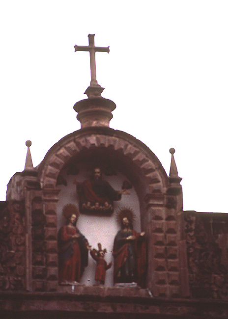Source: WTL photo taken with a shaking zoom lens outside the Holy Family Chapel in Cusco. Comments: In the niche above the entrance to the building you see in Cuzco #11 is this devotional bas relief sculpture montage of the Holy Family: to wit, Mary, Joseph, and Jesus. Notice the typically Spanish polychrome coloring of these statues. Humanities theme: religio. |