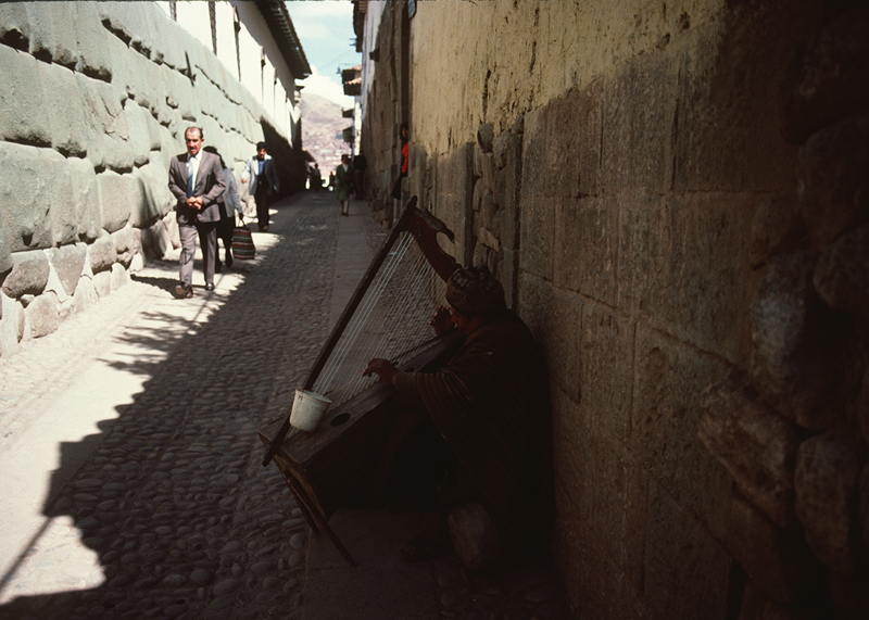 Comments: Here you see a blind Peruvian harpist in the shadow of a narrow street in the historical center of Cuzco. In Latin America there are uniquely traditional harps of various styles: Mexican, Venezuelan, Paraguayan, and Andean. Here you see an Andean harp being played by a Quechua musician playing traditional Andean melodies. All Latin American traditional harps are variations of Spanish Baroque harps, which were cross-strung, double strung (Italian style), or single-strung, as is the harp seen here. The most popular of the Latin American harps is the Paraguayan harp: it is Paraguay's national instrument. Among the most famous and most accomplished Paraguayan harpists is Alfredo Rolando Ortiz (see his website: http://www.alfredo-rolando-ortiz.com/).