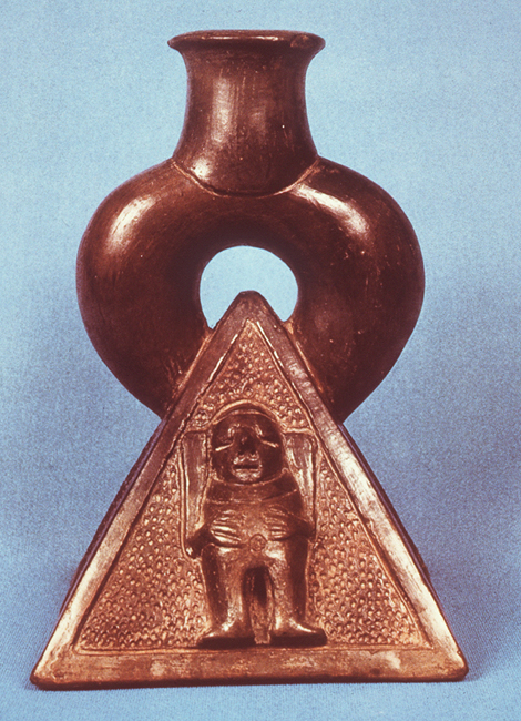 Source: WTL course archives. Art Object: Stirrup-spout terra cotta vessel from the Chavín culture (1200-600 BCE). Comments: This small piece is less than a foot high. The Chavín culture covered a large area from northern Peru to near the area where Lima is now. Experts agree that it was a theocratic civilization that centered on settlements along rivers and the ocean coast. Chavín art features polished stone and polished cermanics with engraved designs on them, which, for the most part focused on men or animals. Often men and animals seem fused together or blended. Humanities Question: Which of the Chavín characteristics mentioned in Pre-Inca Art #1 are seen in this terra cotta piece? |
