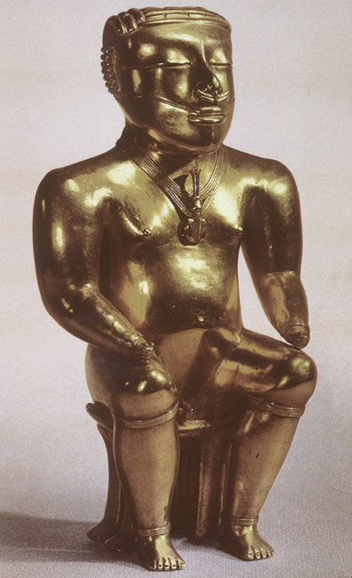 Source: WTL course archives. Comments: Another golden statue from the Quimbaya culture, Cauca Valley, Colombia. This one is about 8 inches high. Humanities Question: Referring to the description of Quimbaya culture in the previous page, what do you see in this golden statuette? What is the relationship in it between realism and abstraction? |