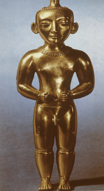Source: WTL course archives. Statuette: Here we see a statuette of a naked man fashioned out of gold. Comments: Another golden statue from the Quimbaya culture, Cauca Valley, Colombia. This one is about 10 inches high. Humanities Question: Can you imagine that when the first Spanish conquistadors saw this objet d'art or ritualistic statuette they imagined that it represented a real man? What is the relationship between objects used for religious ceremonies or rituals and those used for the purposes of art? |