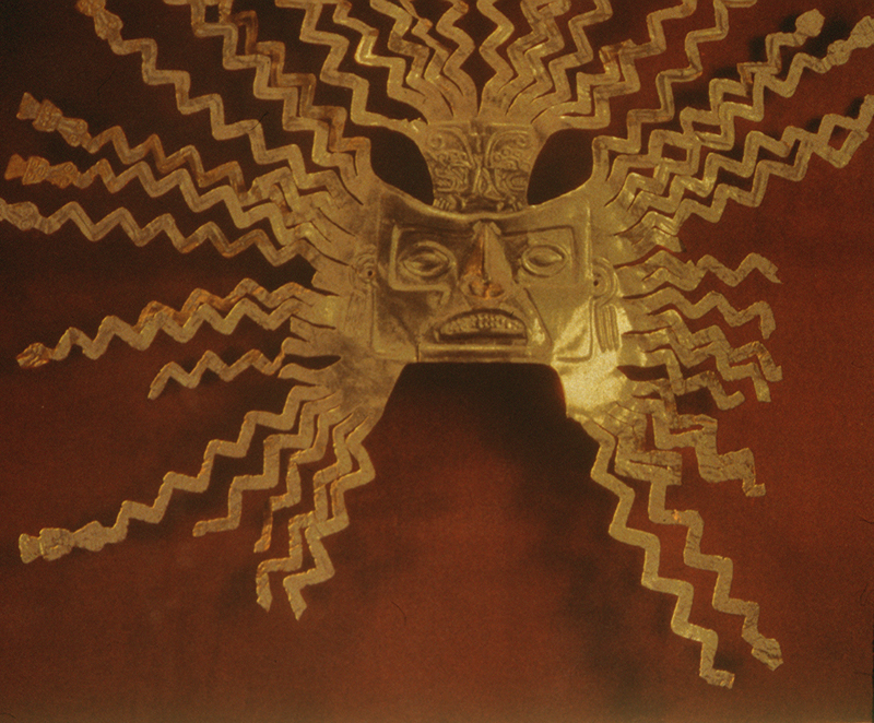 Source: WTL course archives. Object: This is a gold ornament that represents the sun god (500 BCE - 500 CE). It is about 16 inches across (the photograph is cropped). Comments: This is a golden religio-artistic object of the sun god that comes from the La Tolita culture near Mongoya, Ecuador, which is on the Pacific coast NW of Quito. Humanities question: What is the relationship between this ornament from a pre-Inca culture and the Inca religion per se? |