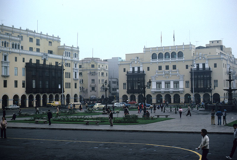 Source: WTL photo taken on site in Lima. Comments: We have come straight into the city's core at a corner of the Plaza Mayor (central square), where we find the post office. Here you get some idea of the Spanish concept of urban design: a central square with a grid of rectangular streets leading from its four corners. This plaza is just off to the side of the main Plaza Mayor, which is to the right, and which we shall see next. Pizarro himself designed a grid of 117 city blocks (9 streets by 13). The buildings see here, and, indeed, most of the historical core of Lima was rebuilt after a powerful earthquake destroyed the city in 1746. Perú lies along the earthquake zone that rims the entire Pacific Ocean. Humanities topic: Describe four distinctive architectural features you see on these buildings. |