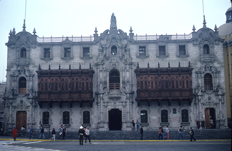 Source: WTL photo taken on site in Lima. Comments: The Palacio del Arzobispo (bishop's palace) alongside the national cathedral. Notice the late renaissance and early Spanish baroque style of the façade, plus the ornate prante wood-covered balconies. This building was rebuilt in the 1920s. The Catholic Archbishop of Lima still resides here and conducts all Catholic diocesan business from here. |
