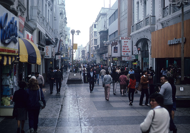 Source: WTL photo taken in downtown Lima. Comments: A sudden change of scene: one of the busy streets that lead directly off of the Plaza Mayor. This is a picture of people in busy, modern, commercial, urban Lima. Note the effect of the garúa on the people's clothing, the pavement of the sidewalk, and the pedestrial street (peatonal). This photo was taken in July. |