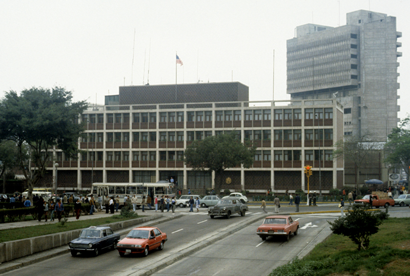 Source: WTL photo taken on site in Lima. Comments: The building in the foreground is the American embassy, flying its national symbol top center. The building in the background right is an international hotel. Both buildings are twentieth-century modern in style. In other words, Lima is also a fully modern city, and it is articulated to America's international and commercial interests. |