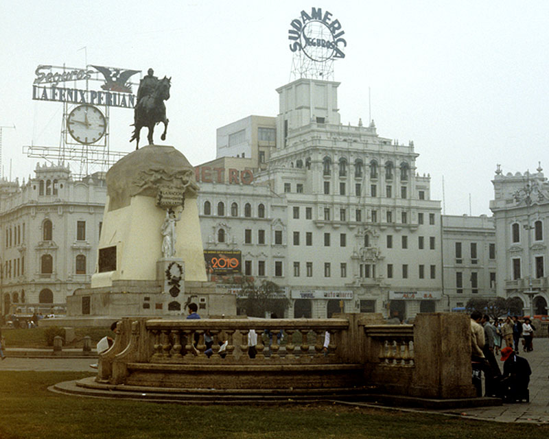 Source: WTL photo taken on site in Lima. Comments: Return to downtown Lima. This statue is dedicated to Simón Bolívar, the great liberator of the northern half of South America. He fought the war of liberation in the core of the Andean region from 1820 to 1824. Bolívar was Peru's president from 1824 to 1826. The final victory took place at Ayucucho on December 9, 1824. Bolívar met his future significant other, Manuela Sáenz, the Ecuadorean wife of a British doctor, when he attended a party in Lima. |
