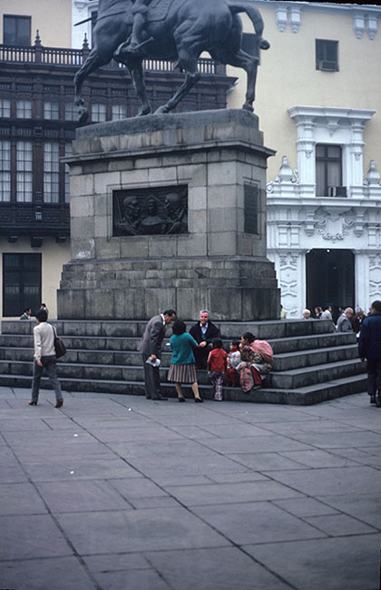 Source: WTL photo taken on site in Lima's central Plaza Mayor. Comments: The monument to Pizarro. In this photograph Pizarro is not featured. Instead the photographer is focussing on another scene taking place in modern Lima. Describe the scene. |