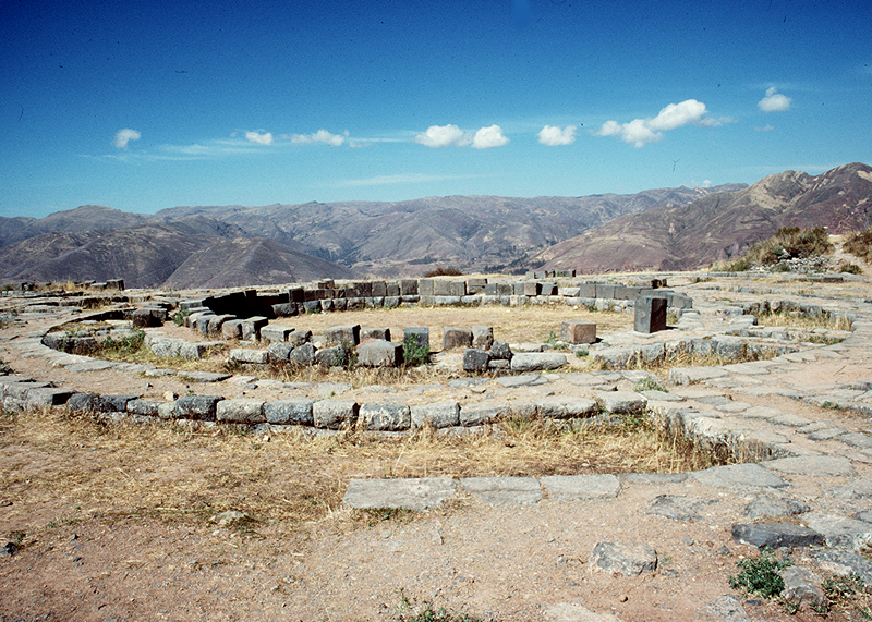 Comments: This circle of stones is found at the edge of the site, with the colonial city in the valley below. Although archeologists do not know for certain what the purpose of these stones was, it is generally assumed that it was used for religious rituals. One possibility is the Quechua/Inca celebration of Inti Raymi (Festival of the Sun). Inti was/is their god of the sun. Inti Raymi marked the winter solstice and the new year in the Inca empire. For the past half century residents of Cuzco and thousands of national and international tourists meet for a festival at the time of the summer solstice on June 24 (also the Spanish Catholic Día de San Juan). According to the great colonial Peruvian writer Inca Garcilaso de la Vega (1539-1616), Inti Raymi was celebrated during nine days with dances, parades, and animal (not human) sacrifices the purpose of which was to invoke a good agricultural growing season. In 2008 archeologists discovered at the edge of Sacsayhuaman an ancient temple (not shown in this series of photos) built by a pre-Inca civilization (900-1200 CE).