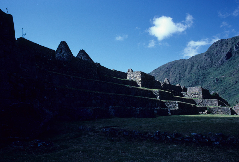 Source: WTL digitized analogue photograph taken in the morning at Machu Picchu. Comments: Early in the morning, the professor-photographer, on this particular morning, was the first (living, breathing) visitor to the ruins. Only the imposing and protective mountains, the clear blue thin sky, the now lifted fog, long morning shadows, bright young light, and silent (?) stone ruins. And a lot of questions... |