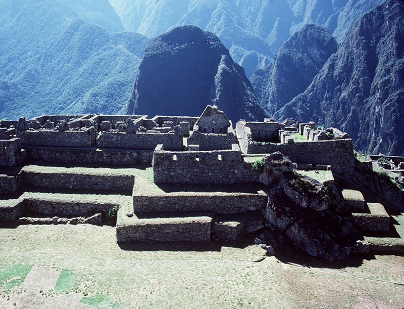 Source: WTL photo taken on site in Machu Picchu. Comments: This view was taken from the north side of the central square. You can see the centerpiece of the place that is at the photographer's back in Machu Picchu #17. In the present image we are looking toward the so-called Barrio industrial (manufacturing neighborhood). Beyond this neighborhood and on the slope below it are the lower cemetery and the funeral grottoes. |