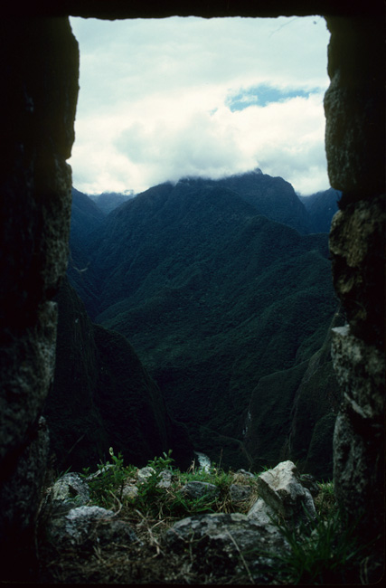 Source: WTL photo taken on site in Machu Picchu. Comments: The view through a window in a house that was constructed on the very edge of a precipice on the south side of Machu Picchu. This photo was shot on the second day of the professor-photographer's visit there. The previous image (Machu Picchu #12) was shot the day before when he was suffering the disorienting after-effects of el soroche (altitute sickness). He was cured by a mysterious Quechua in Cuzco. (Inquire in class about what this cure was.) In the photographer's opinion, the (artistic/humanistic) quality of this second-day photo is superior to the earlier photo. What do you think? |