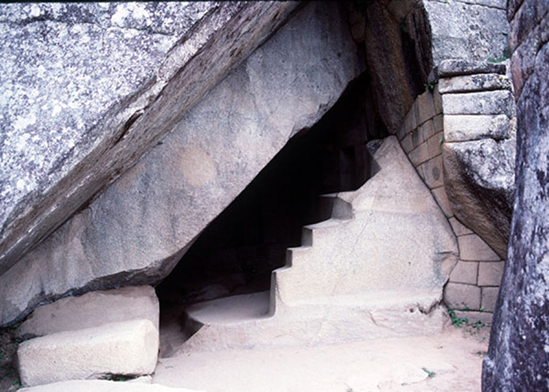 Source: WTL photo taken on site in Machu Picchu. Comments: This site carved out of the granite mountain itself (la roca viva) is identified as the Inca's tomb (i.e., the Inca emperor's tomb). Some of the skeletons that Hiram Bingham found at Machu Picchu in 1911 were found in this cavelike tomb. The feeling created by this place (i.e., natural stone and carved rock) was very powerful. To get a playful sense of size and scale, see the imbedded image: => Machu Picchu #16a. |