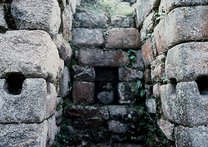 Source: WTL photo taken on site in Machu Picchu. Comments: Here is a close-up of one of the "execution seats" with the rope holes on each side. Interestingly, at the back of each seat is a niche for an icon, no doubt a god or sacred object related to Inca justice. |