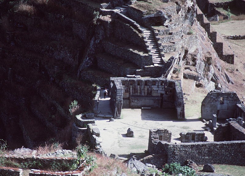 Source: WTL photo taken on site in Machu Picchu. Comments: Near the center of this photo you see a woman illuminated by sunlight coming through a window. I asked myself why this and other women--Peruvian and foreign women--tended to walk alone, in solitude, through the ruins. By contrast, men visitors (except for the professor-photographer) toured the site in groups. What was going on? |
