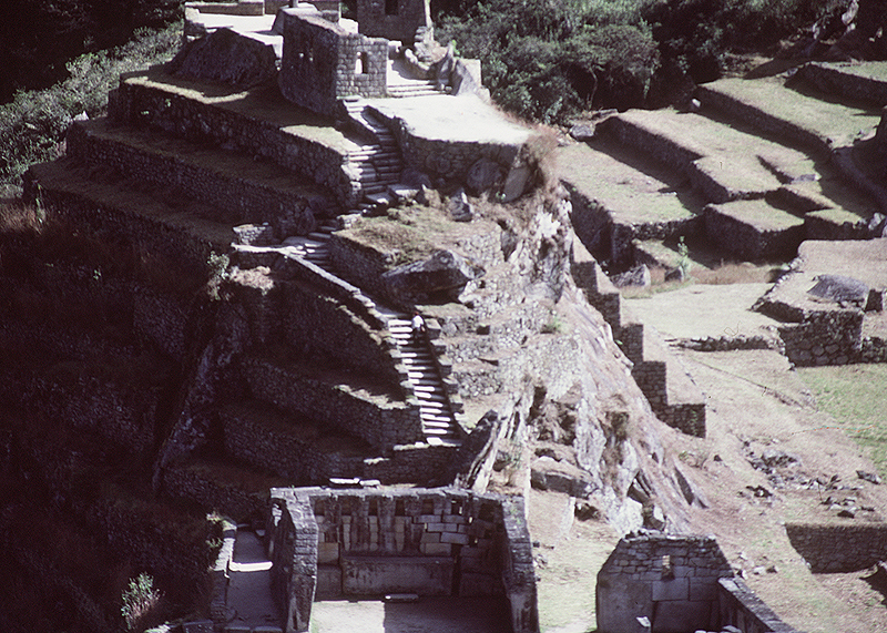 Source: WTL photo taken on site in Machu Picchu. Comments: The same woman is now seen in the very center of this photograph, still entirely alone. She was not unique. Other women seemed to seek solitude. What were they doing? Why, by contrast, were men so active? And in groups? |