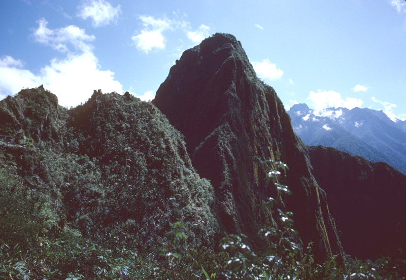 Source: WTL photo taken on site in Machu Picchu. Comments: The mountain in the center of this photograph is Huayna Picchu, which means "young mountain", as opposed to Machu Picchu, which means "old mountain". Although it seems like "just another mountain" in the Andes, it was actually fairly significant for the Inca. |