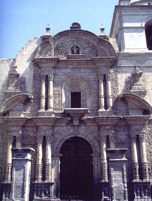 Source: Gauvin Alexander Bailey, The Andean Hybrid Baroque; Convergent Cultures in the Churches of Colonial Peru. Notre Dame, Indiana: University of Notre Dame Press, 2010, plate 2.3. "The façade incorporates almost the full repertoire of Andean Hybrid Baroque motifs. The lower story is flanked by giant carved borders composed of serpentine monsters with massive jaws—figuras parlantes—that emerge from scrolling vines that scholars have compared to centipede bodies [...]. These creatures disgorge cactus flowers, pomegranates, tobacco-like leaves, cantuta scrolls, and mustachioed monster masks with vines emerging from their mouths [...]. Just inside these serpentine cornucopias is an eight-link chain containing four- and eight-petal rosettes and crowned with a shell. Richly carved panels adorn the space between the columns [...]. At the top of each is a winged cherub with cantuta blossoms dangling from its wings and resting on cactus flowers, grapes, and pomegranates. Below is a pair of crests bearing the inscriptions "EL AÑO" on the left) and "DE 1698" (on the right). The crests are surrounded by tobacco-like leaves with triple feather plumes at the top, and they rest on the shoulders of a long-haired male caryatid holding two bunches of grapes, his upper body dissolving into leaves and a pomegranate. The lowest part of the panel frames a double-handled vase of scrolling flowers inhabited by four small songbirds. The relatively plain doorway has rosette voussoirs [truncated wedge-shaped pieces that form an arch or vault] and a scrolling, corbel-like keystone, common throughout the southern Andes" (pp. 52-53). |