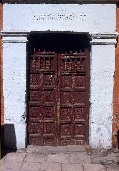 Source: Digitized analogue photo taken by WTL© on site in the Monasterio de Santa Catalina. Comments: Here is a door of one of the convent's old cells (no longer occupied) in the area open to visitors. The color of the walls around the doorway tells you this cell's proximity to the outer world. The beautiful wood carving represents an art that Spanish and Latin Americans practised with distinct skill and artistic talent. The nun's name is above the door. |