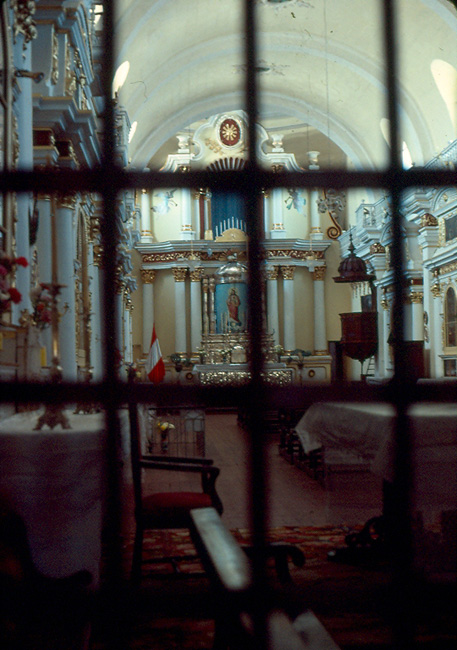 Source: Digitized analogue photo taken by WTL© on site in the chapel in the Monasterio de Santa Catalina. Comments: Here we stand behind the iron grill that separates the nuns from those allowed to enter the chapel. That is, since men and women were separated, the nuns remained (safe) behind the bars where the photographer is standing while men (i.e., priests and others) occupied the chapel. Notice the chapel's elegant late baroque or Spanish rococco (neoclassical) style of the early 18th century, when the convent was finished and functioning at peak capacity. The gold decorating the columns comes from the Spanish conquest and was provided by the nuns' rich families. |
