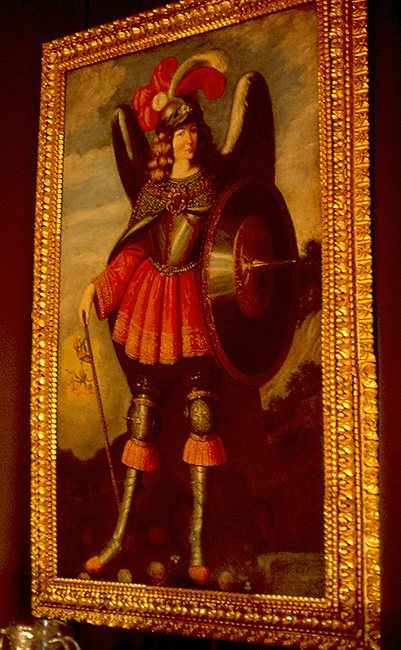 Source: Digitized analogue photo taken by WTL© on site in the Monasterio de Santa Catalina. Comments: This is an 18th century Spanish painting of San Miguel (Saint Michael). Notice the ornate gilded baroque frame. Saint Michael is one of the saints who battled most vigorously against sin and evil, which spiritual battle is one of the main raisons d'être of Catholic convents and monasteries. For a far different use of the image of the saint featured in this 18th century painting, in a far different context, see: => Mercado Coyoacán. |