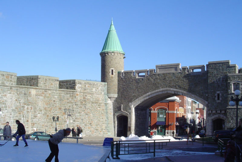 Comments: Here you see the city's Porte St. Jean (St. John Gate), one of the entrances through the city's old wall. Québec is basically a walled city in the European tradition. On the other side of this gate is the Rue St. Jean (St. John Street), where one finds very charming boutiques. Once again you can see winter's snow foreground and scraped from the street. Typically, in winter, one sees people playing ice hockey in many places throughout the entire province of Québec.