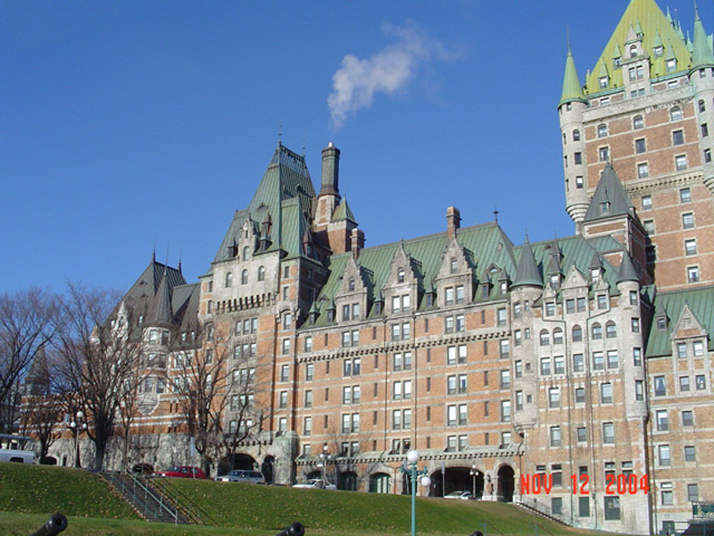 Comments: The name of this grand hotel—le Château Frontenace—that is situated on the extreme eastern point of the city's promontory over the St. Laurence River, comes from Louis de Buade, the count de Frontenac. This location is the most famous point of reference in the city. The point is called Cap Diamant [Diamond Cape]. Very near here is where Samuel de Champlain, the great French explorer, founder (1608), and colonist of New France (la Nouvelle France), constructed Saint-Louis fort in 1620. This hotel was built in 1893. The hotel is owned by le Chemin de fer Canadien Pacifique (CFCP) / Canadian Pacific Railway. Louis de Buade was the governor of la Nouvelle France twice: 1672-1682 et 1689-1698. He was a dynamic and strong governor.