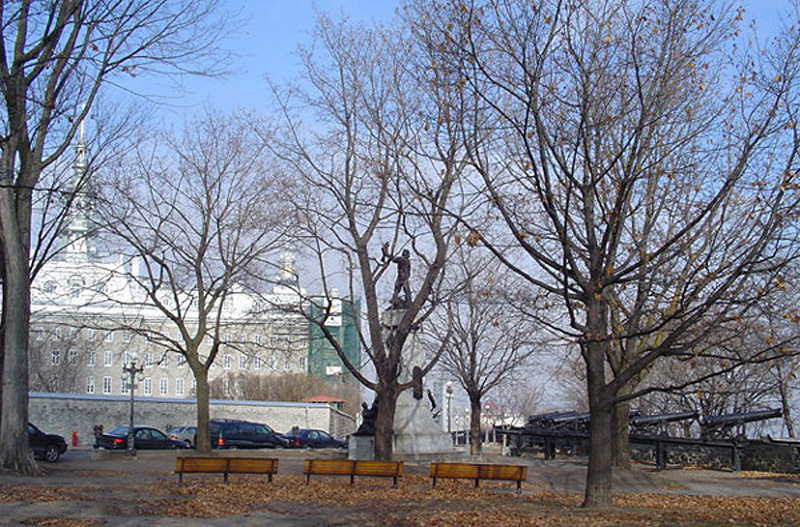 Comments: Moving to the center of this park we see the Old Seminary background left and at the center, behind a tree, we see one of many statues throughout Québec. At the right are old ancient cannons that guarded narrows of the Saint-Laurent River on the south side of the city.