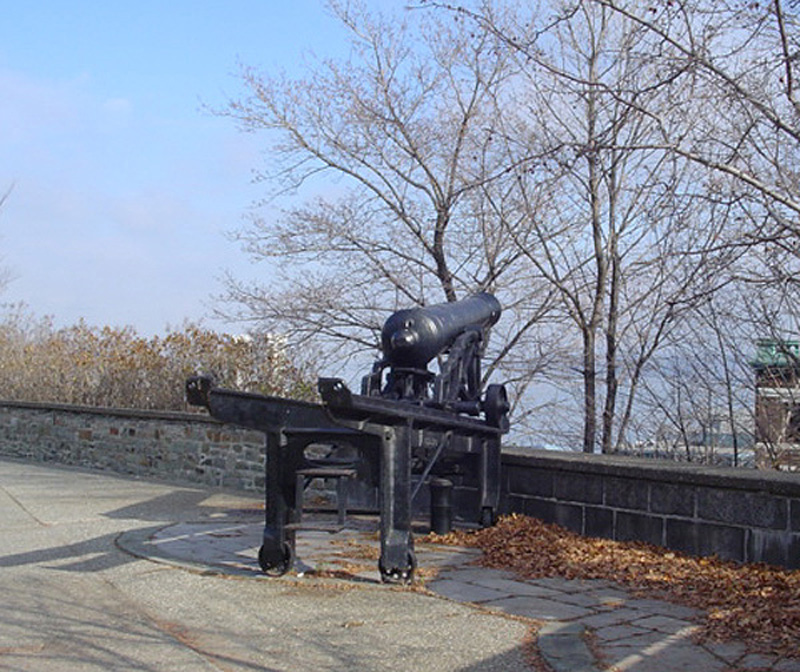 Comments: Through the bare trees we see the St. Lawrence River (French: le fleuve Saint-Laurent; Mowhawk: Kaniatarowanenneh, or "big waterway"), the immense seaway that flows 1,900 miles northeasterly from the Great Lakes to the Atlantic Ocean. It forms part of the international boundary between Ontario, Canada, and New York State, USA. You will also note how high Québec's upper city is above the river and lower town below. In the Algonquin language of the First Nations who inhabited the region of Québec, the work kebec means "the place where the river becomes narrow." It is due to this geographical phenomenon that the French explorers under the command of Samuel de Champlain began to built a fortified city here in 1608.