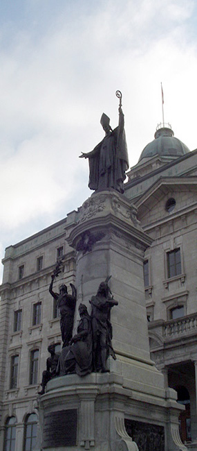 Comments: Here is the same monument seen on page #27, but this time from another angle. Also, here the base of the monument with a somewhat clearer (the professor-photographer deliberately left the image on the dark side) view of the Amérindiens below and the "grandeur" of monsieur l'évêque de Laval above. (Hint: the bishop is seen in clear silhouette whereas the Amerindians are in muddied shadow; photographing them in silhouette bacgrounded in light clouds behind proved to be impossible.)