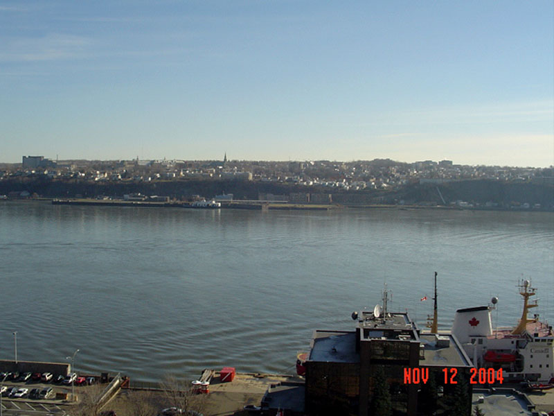 Comment: This photo was taken from a promenade on the south side of the Château Frontenac (hotel). We're looking across the Saint-Laurent toward the city of Lévis, which was founded by François-Gaston de Lévis, second marquis de Montcalm and a hero of the battle of Sainte-Foy (1759) against the English. In the center of Lévis we see the tower of the Notre-Dame-de-la-Victoire Catholic church (1851), whose architect was Thomas Baillairgé. The Saint-Laurent River here is quite narrow; hence, it was of strategic importance when the French were struggling to maintain control of Canada from the English periodically throughout history of the region.