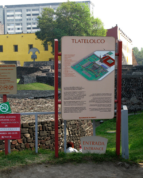 Source: WTL photo taken on site at the Plaza de las Tres Culturas in Mexico City. Image: The sign at the entrance to the plaza, which includes an archeological site, the Plaza de la Tres Culturas, the parish church of Santiago, the old convent of Santiago, and a museum. Comments: In 1521 Cortés' Spanish soldiers destroyed Tlatelolco including the Aztec temples that stood on this site. In the pre-Columbian era, Tlatelolco was located on the edge of Lake Texcoco, and it was linked to Tenochtitlán by a causeway. Nowadays and underground subway that floats in the marshy ground connects this plaza with the rest of Mexico City. In place of the tlatelolca buildings and market place, the Spanish built the Templo de Santiago church (1609), which you see on the far side of the plaza. (Santiago was Spain's warlike patron saint.) Behind the church is a modern high rise office building. In this plaza on a night in October, 1968, the Mexican army killed about 400 Mexican students who were protesting the Mexican government's expenditures on the international Olympic Games of 1968 instead of on Mexico's schools and the poor. In addition, Inside the church is the baptismal font of Juan Diego. |