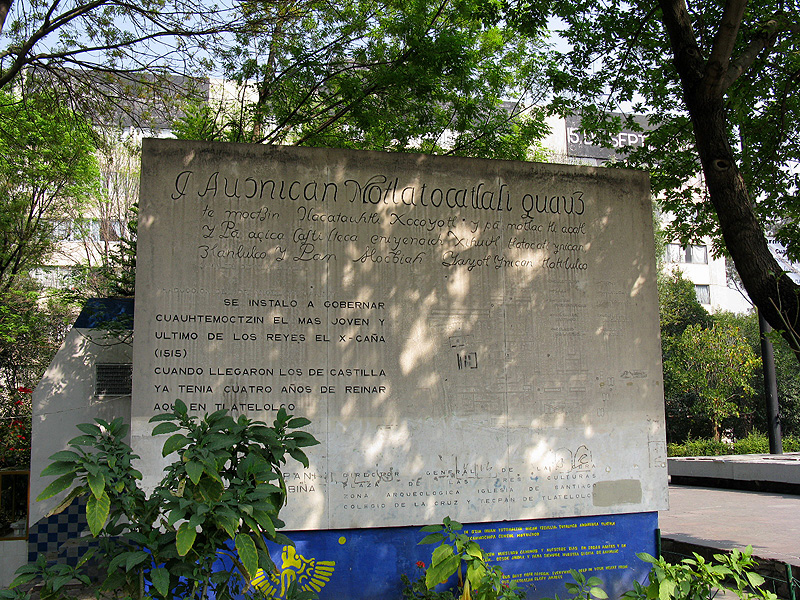 Image: At the end of the entrance pathway to the Plaza we find this bilingual sign (Náhuatl and Spanish), which tells about the last ruler of Tlatelolco, which was a semi-autonomous city on the north end of the island of Tenochtitlán. Tlatelolco was a very prosperous market place. For a close-up of this sign, go to: => Tlatelolco #2a.