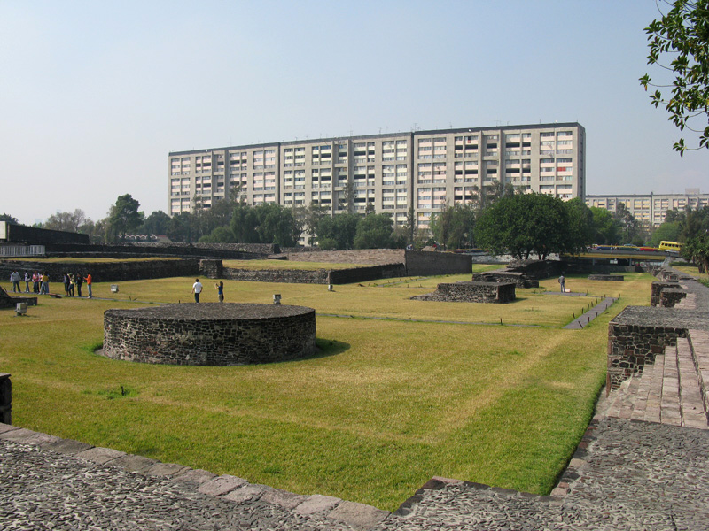 Source:WTL photo in the Plaza de las Tres Culturas, Mexico, D.F. Image and Comments: In this view we are looking over the tlatelolca ruins from an area adjoining the Church of Santiago (at our back). On this site, before the Spanish arrived, there stood a pyramid called the Calendar Temple. The circular platform was part of the temple of Ehécatl-Quetzalcóatl in his dual aspect. |
