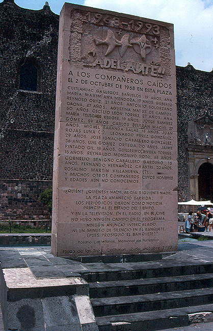 Source:WTL photo in the Plaza de las Tres Culturas, Mexico, D.F. Image and Comments: This monument commemorates the massacre of about 400 students by the Mexican army in October, 1968. In the background is the Church of Santiago, which was built in the sixteenth century by the Spanish with Mexican labor and using stones from the destroyed tlatelolca temples. On October 2, 1968, a few days before the opening ceremonies of the 1968 Olympic Games in Mexico City, hundreds of people were demonstrating against government policies in this plaza. At night the army and other supporters of government repression opened fire on the demonstrators. The next morning the plaza was cleared of bodies and scrubbed clean as if nothing at all had happened. However, news of the massacre spread around the world. It took Mexican political institutions three decades to begin responding to the grievances expressed in the demonstration that took place here. For a close-up of the bottom part of this monument, see: => Tlatelolco #8a. Question: What relationship do you see between this monument and pre-Columbian stellæ? Hint: see: <= Mayan Art #1. |