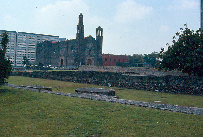 Source:WTL photo in the Plaza de las Tres Culturas, Mexico, D.F. Image and Comments: In the foreground you see what remains of the tlatelolca pyramids in the Plaza de Tlatelolco. Some say that the idea behind the name of this square, Plaza de las Tres Culturas (Square of the Three Cultures), is that around the plaza one sees Aztec ruins, Spanish colonial buildings, and modern Mexican buildings. Another way to understand the triad is Aztec, Spanish conquest, and mestizo Mexico; i.e., indigenous Mexica, Spanish Europeans, and the blended ethnicity of modern Mexico. The Templo de Santiago (1609) stands next to what was once was the Imperial Colegio de la Santa Cruz de Tlatelolco (Imperial College of the Holy Cross convent), which was built in 1535-1536. For a closer view of the church (Iglesia de Santiago Tlatelolco), see: => Tlatelolco #9a. Question: Describe the church's style. |