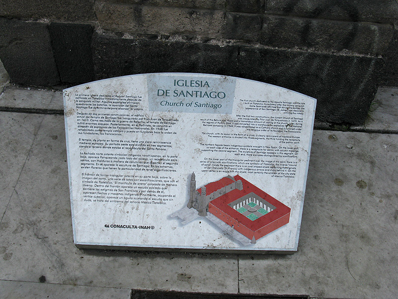 Source:WTL photo in the Plaza de las Tres Culturas, Mexico, D.F. Image : The Templo de Santiago (Church of St. James). Comments: This sign at the church's entrance shows the relationship between the sanctuary and the convent with its secluded cloister in the the middle. The church was built a half-century after the convent. |